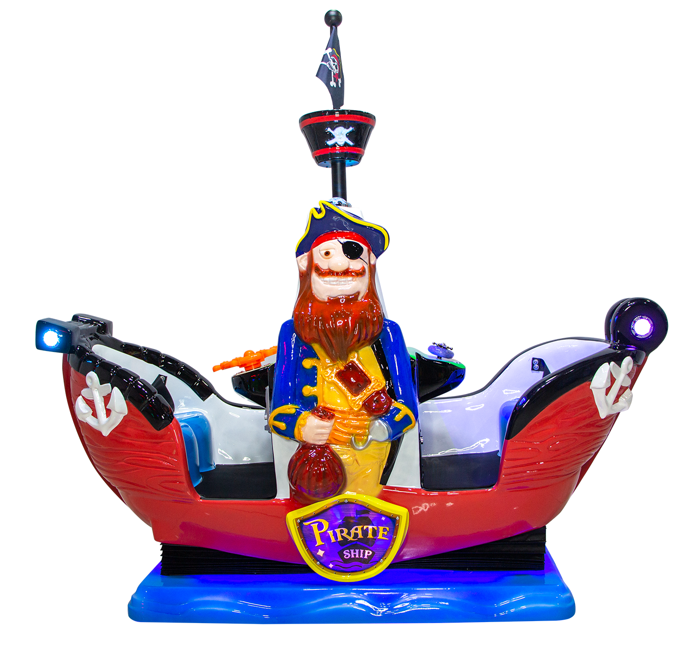 Divertido barco pirata. Dos asientos con diferente juego interactivo. 1 monitor de video juego interactivo para 1 jugador y 2 efectos de sonidos de juego para 2 jugadores.